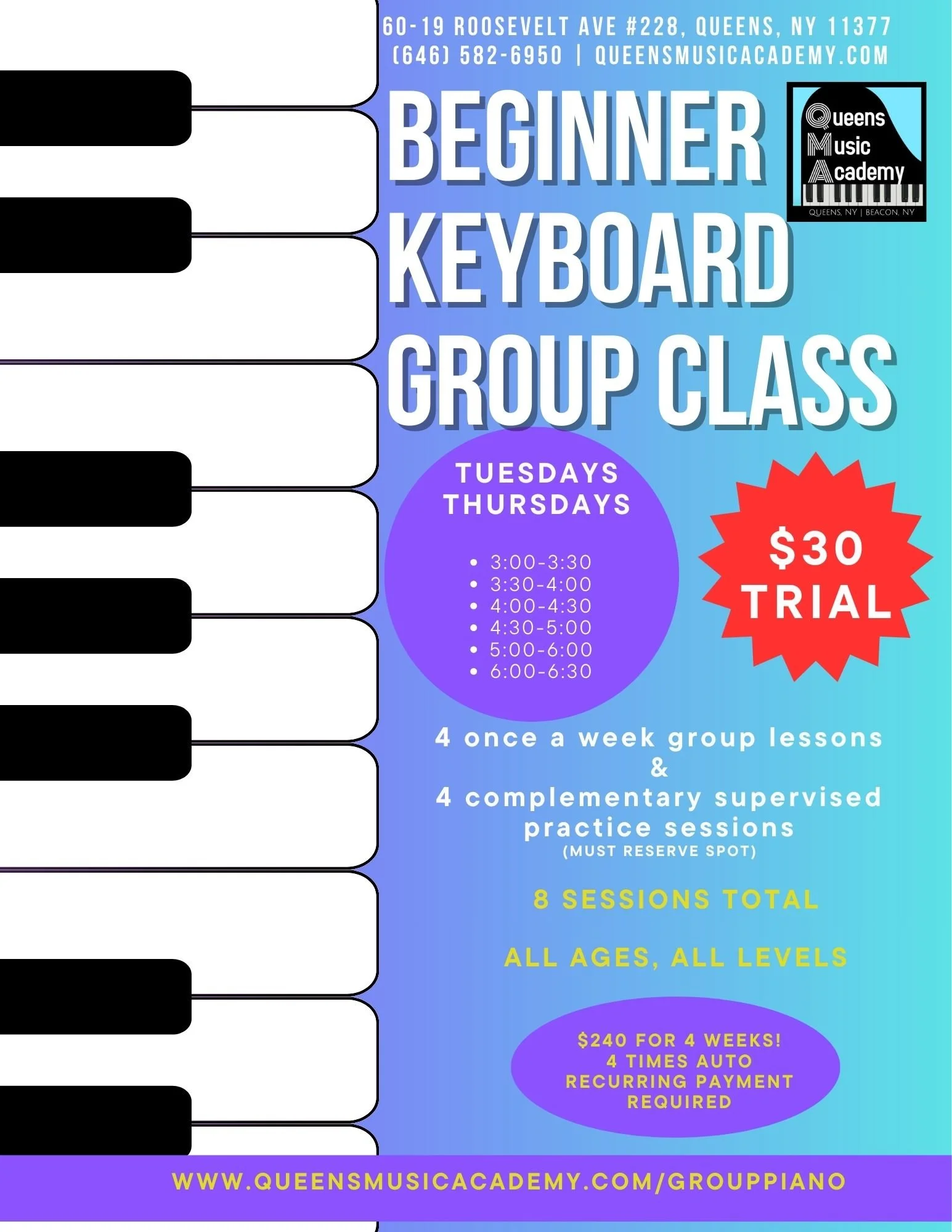 Beginner Keyboard Group class breaks away from the traditional private piano lesson model. Unlock the full potential of your piano learning experience. The teacher will guide a new song each lesson (10 minutes) and the practice by yourself (10 minutes) and then share what you practiced at the end (5-10 min)