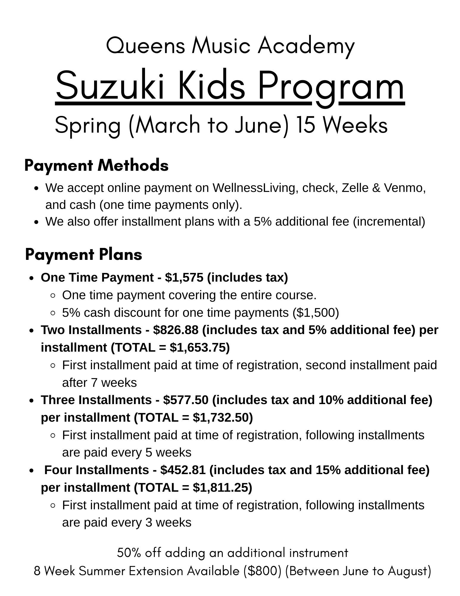Tuition: $1575 + $25 one time registration fee + 5% tax ($1575 in total with trial lesson reduction)