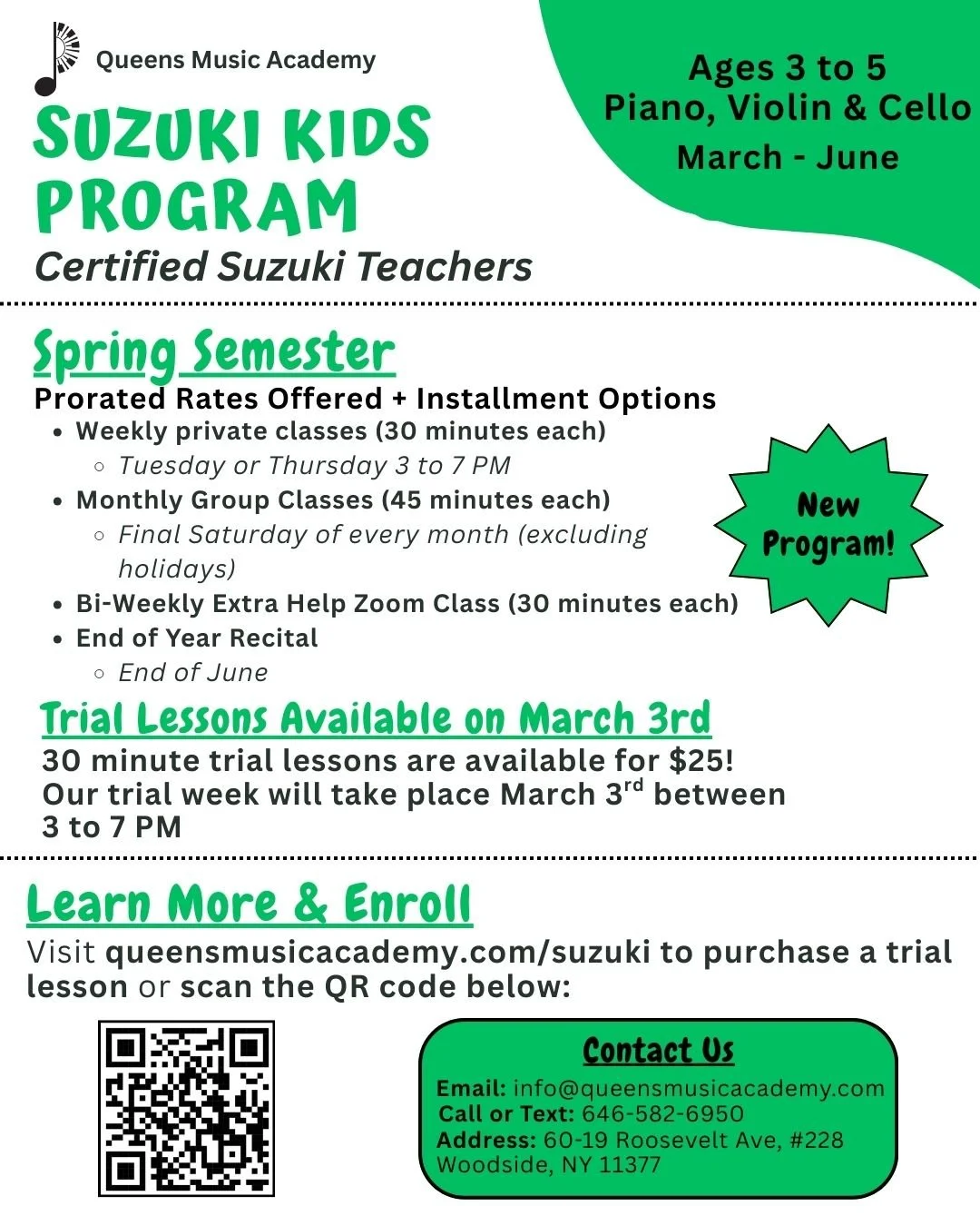 Group lessons are essential for Suzuki Programs. It is a 45 minutes long class that includes rhythm, melody and music theory games and also preparing for the end of recital.